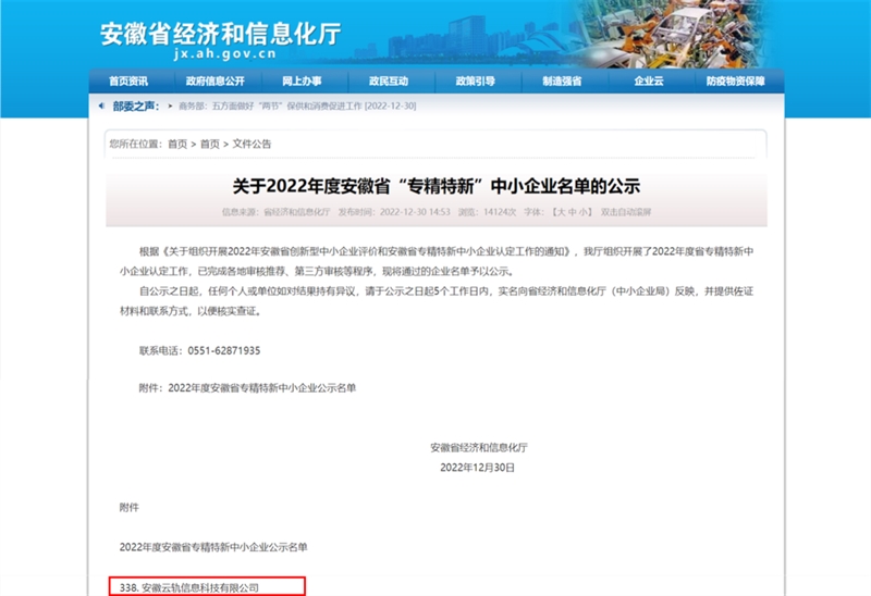 近日,安徽省经济和信息化厅发布《关于2022年度安徽省“专精特新”中小企业名单的公示》安徽云轨信息科技有限公司成功入选。